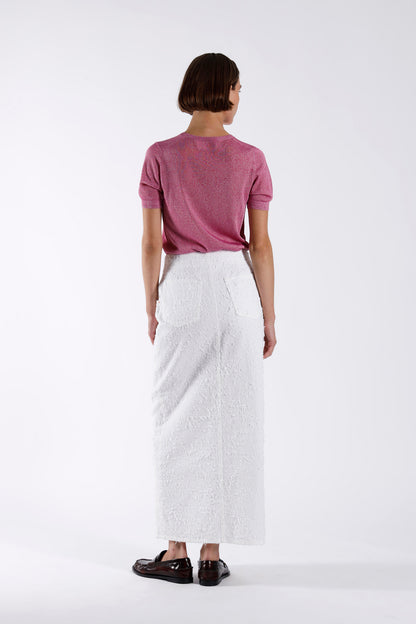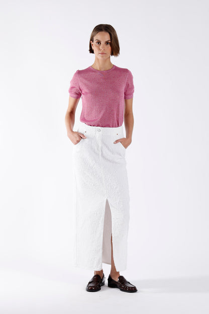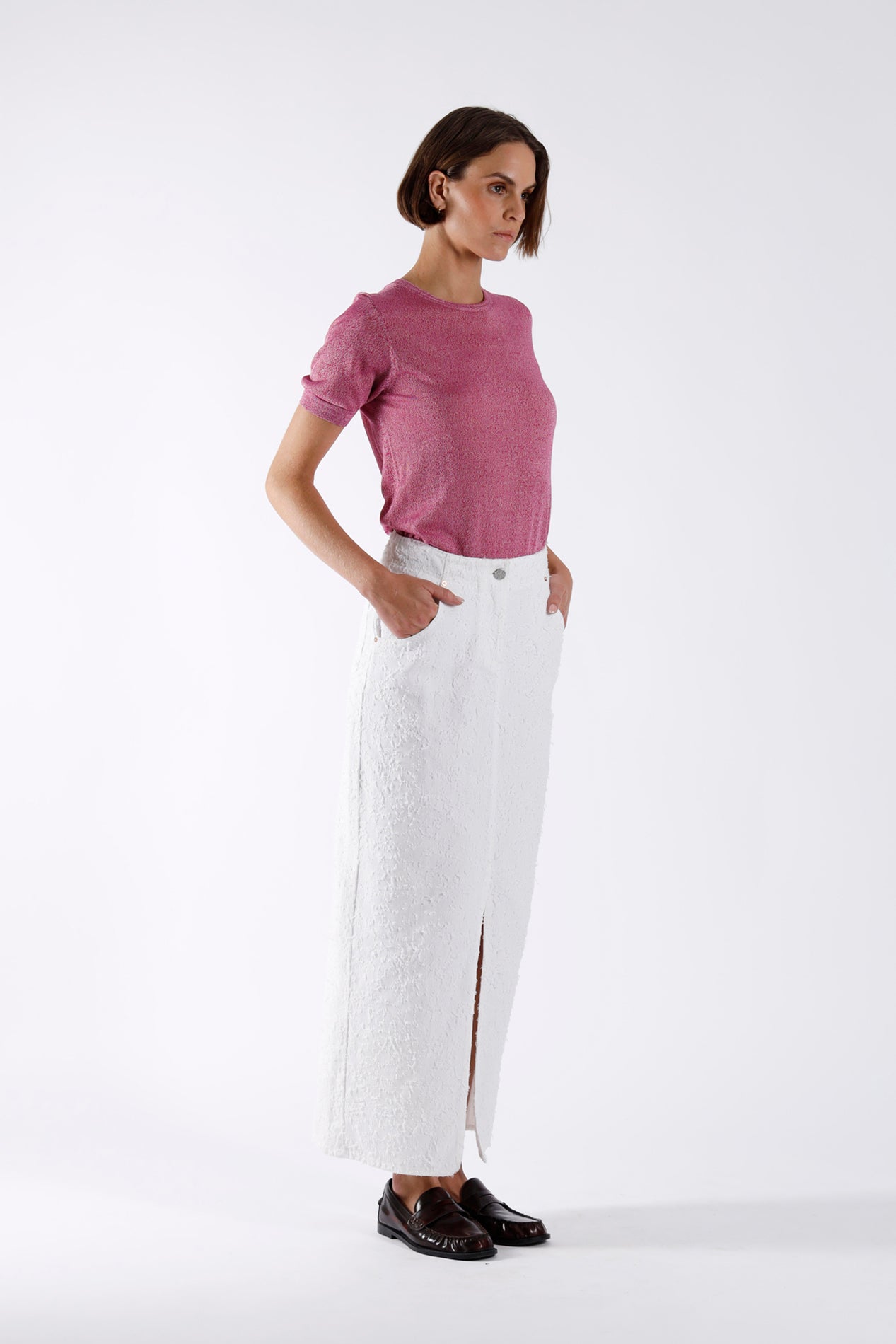 Textured denim skirt with front slit. High-waist and straight maxi silhouette.