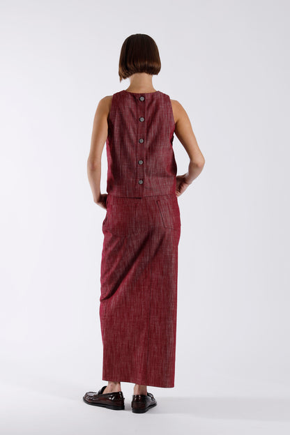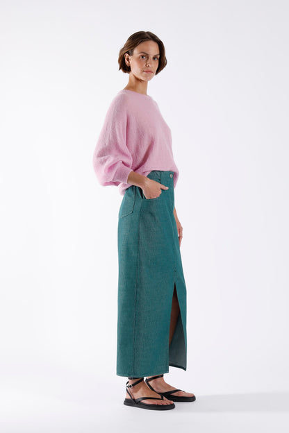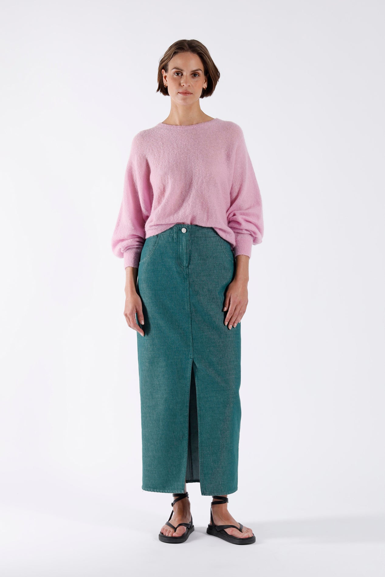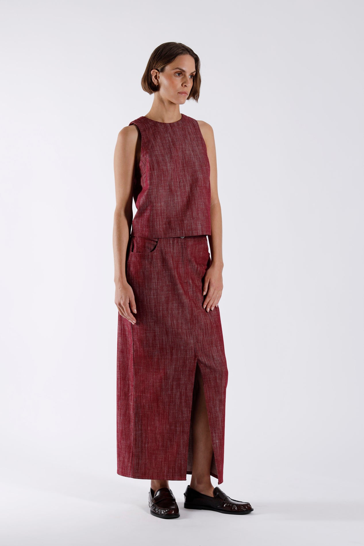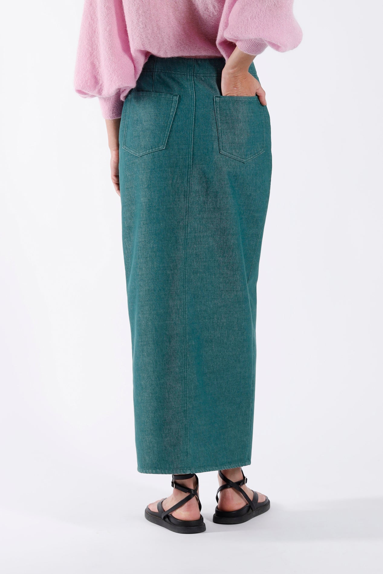 Coloured denim skirt with front slit. High-waist and straight maxi silhouette.