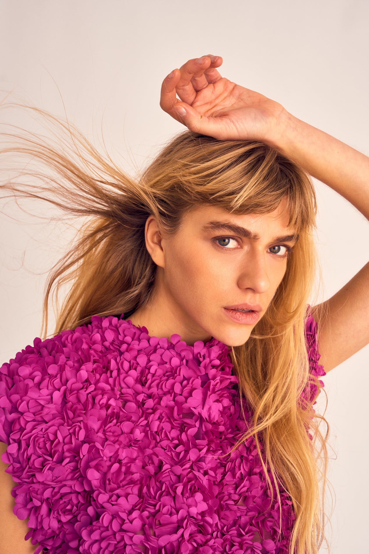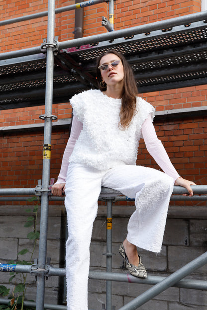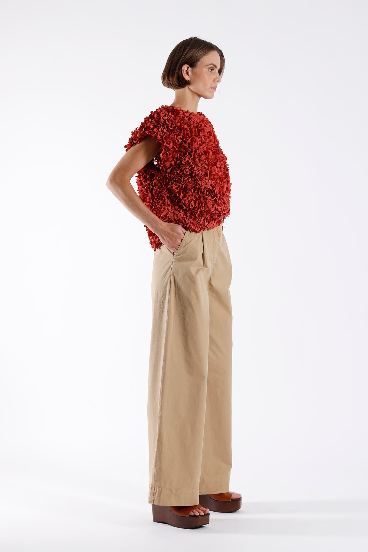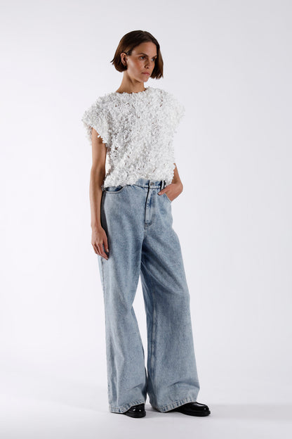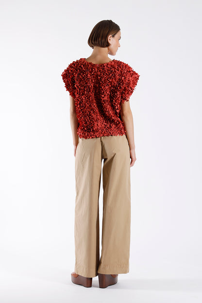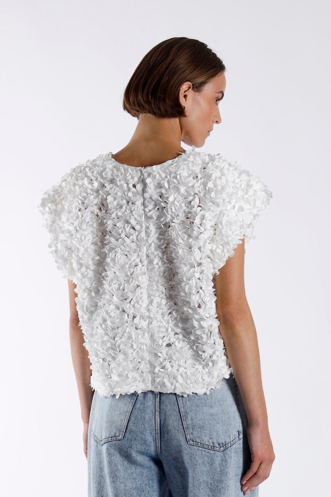 Textured 3D flower top. Sleeveless inverted A-line silhouette with a loose fit. Hidden back zip fastening.