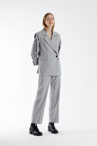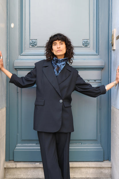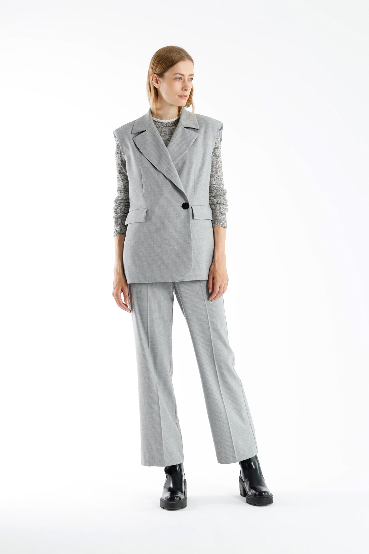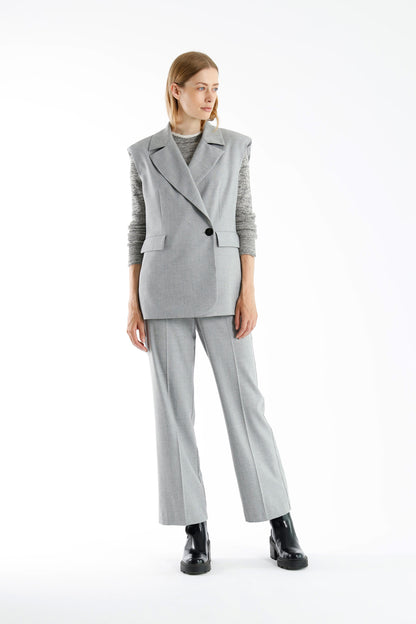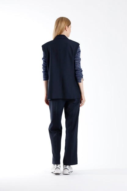 The sleeveless blazer LENOIR easily takes you from day to night depending on how you style this piece. The wide overlap and asymmetrical button add some “je ne sais quoi” to your look.