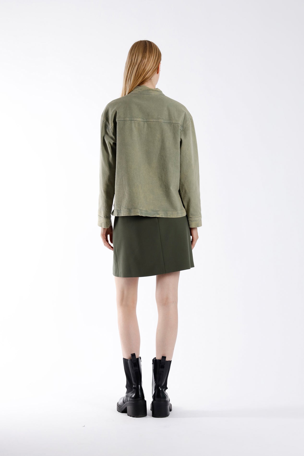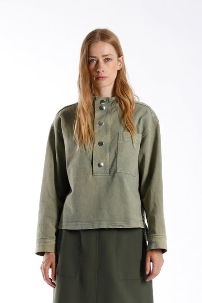 LEVI is the relaxed denim blouse you’ve been looking for. The silver button closure, asymmetrical pocket and dropped shoulder add coolness to any silhouette.