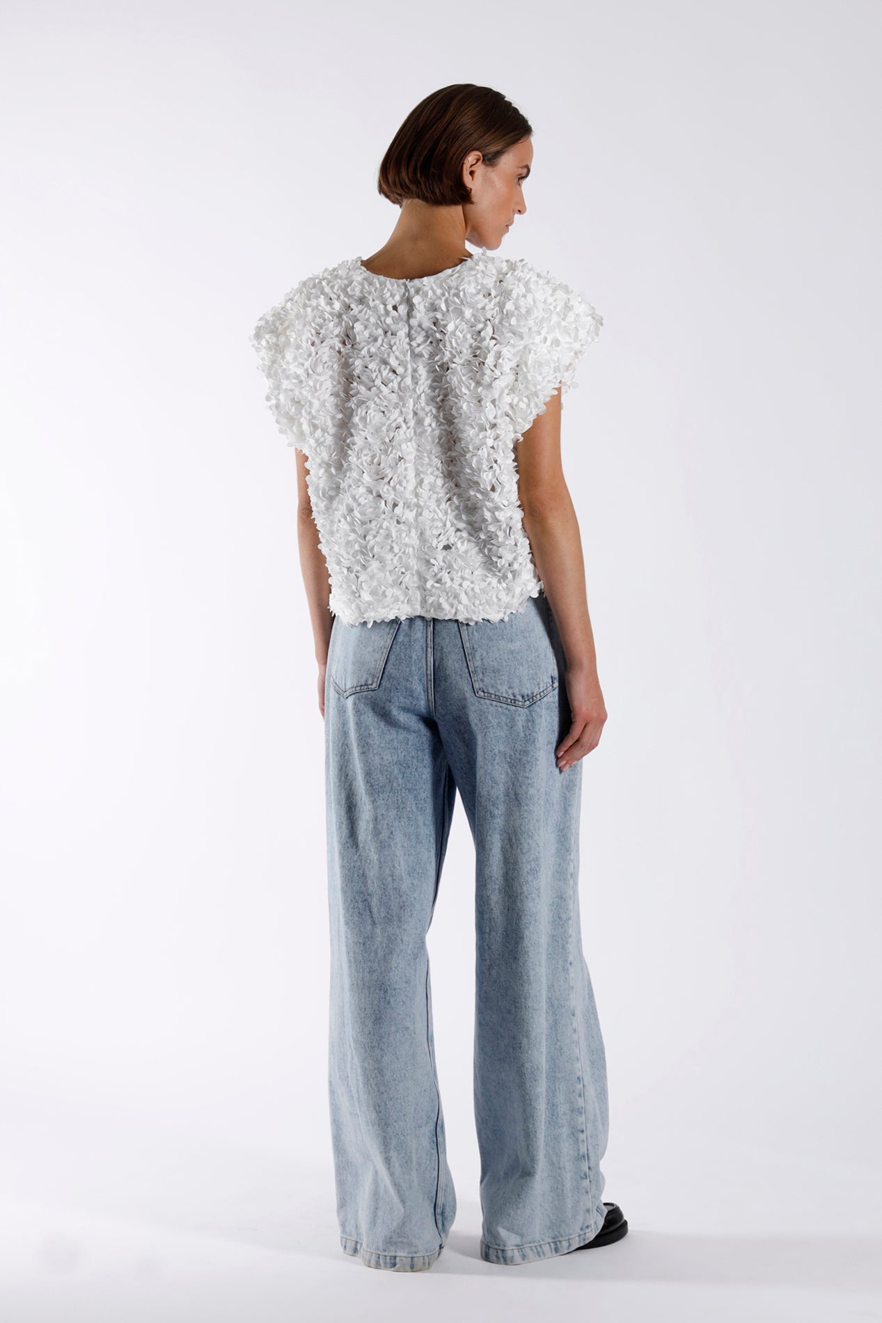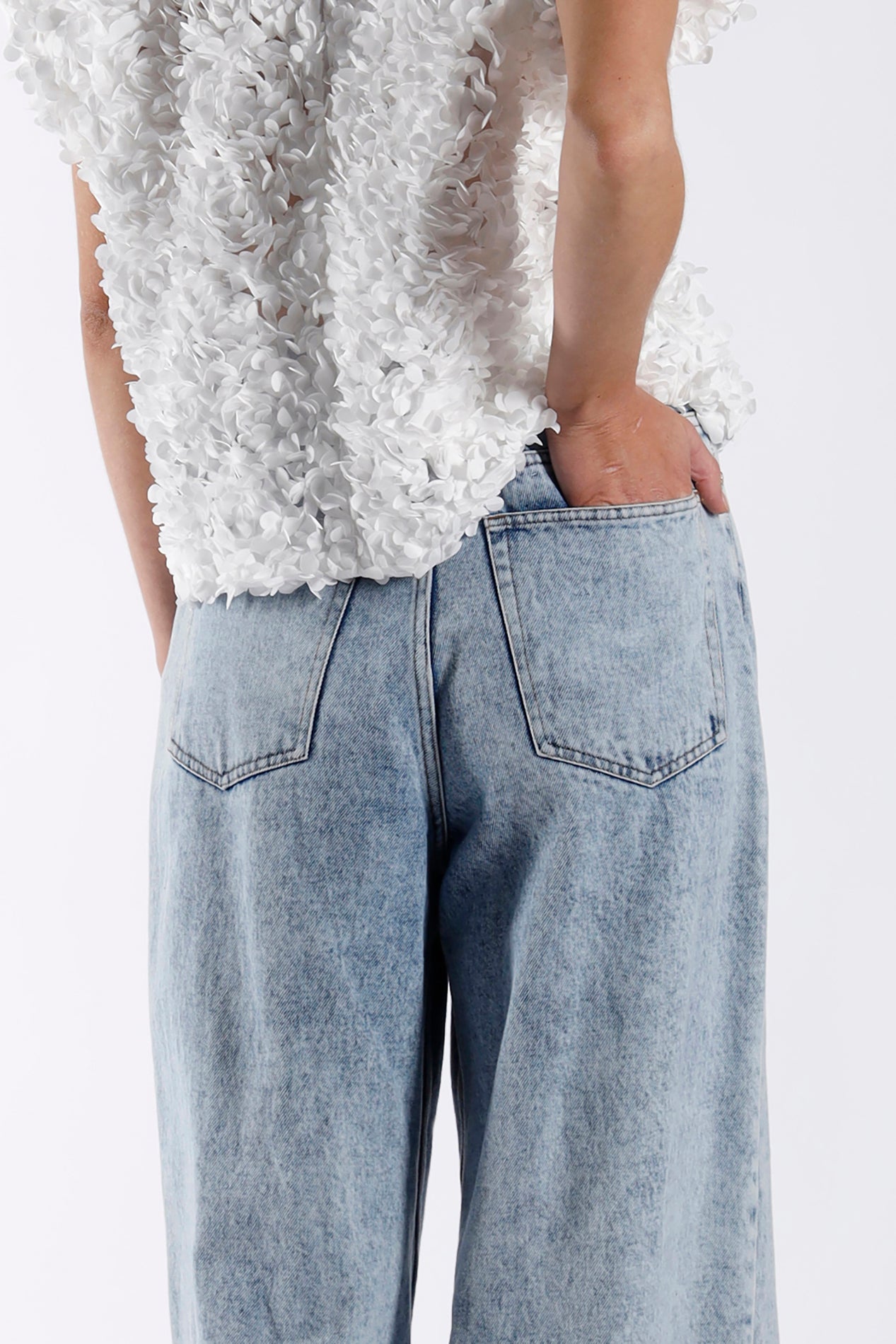 Classic five pocket denim trousers. High-waist with wide straight leg. Stone wash.