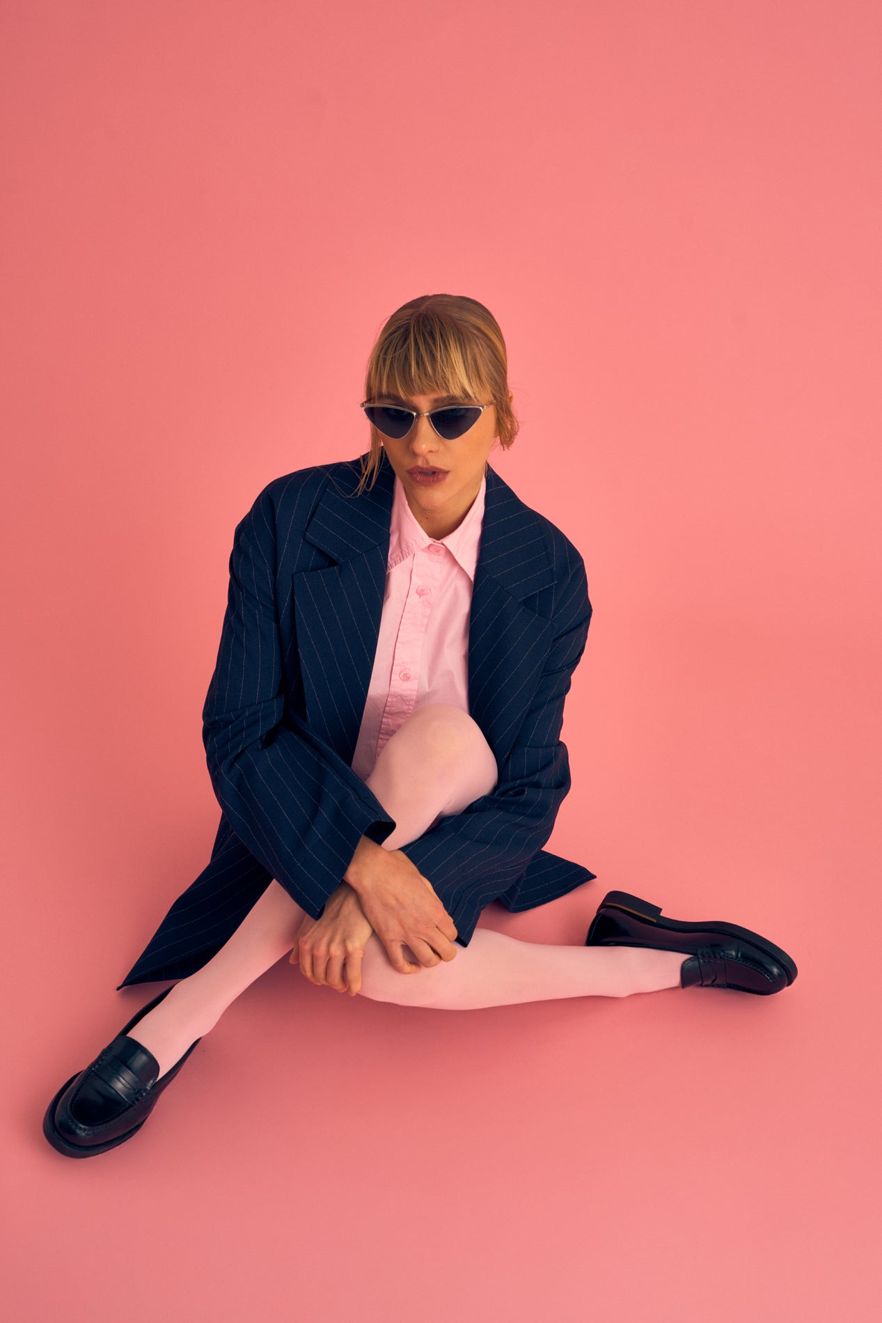 Oversized pinstripe blazer. Wrap-style blazer with large patch pockets and wider lapel. Wear with matching belt to accentuate your waist.