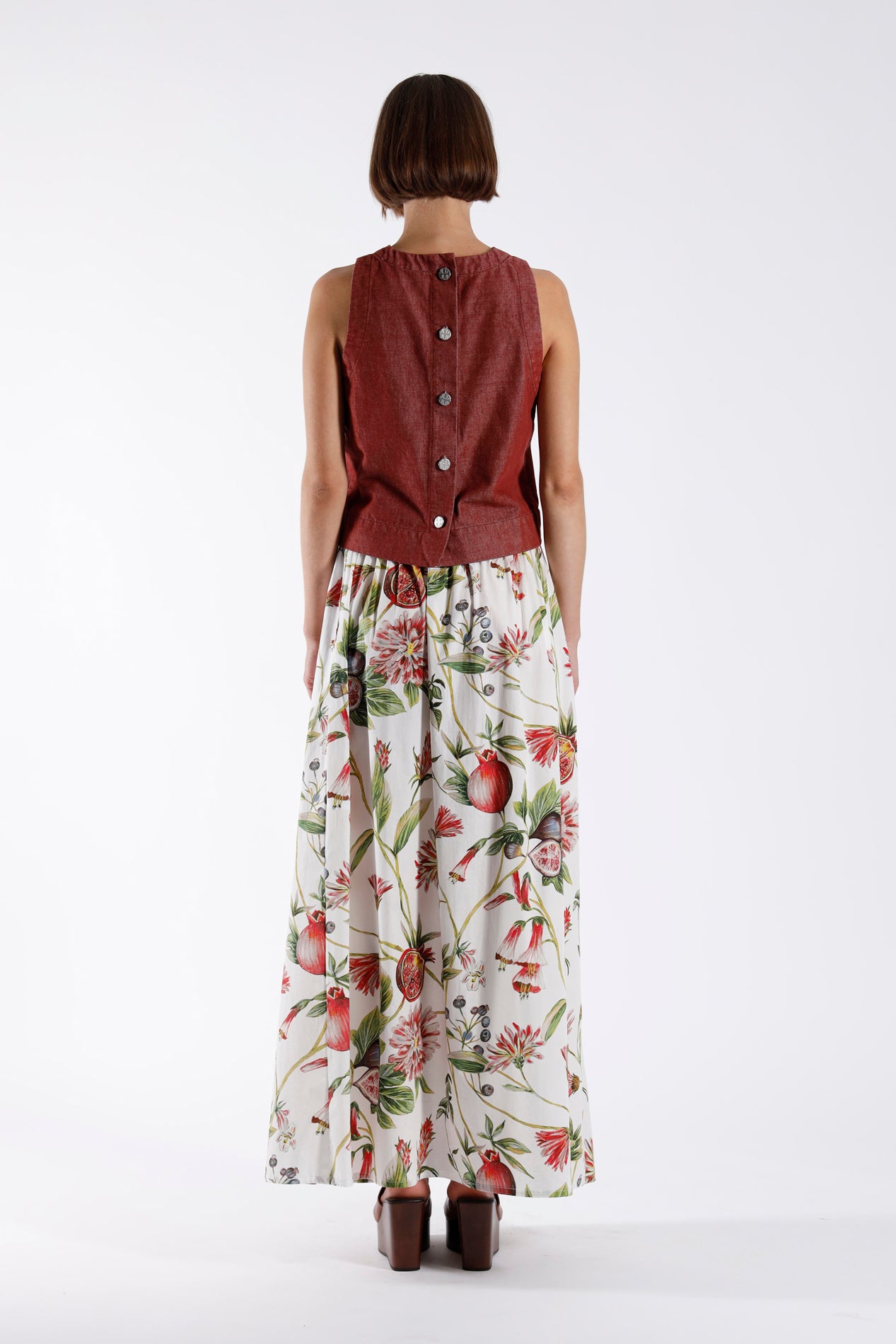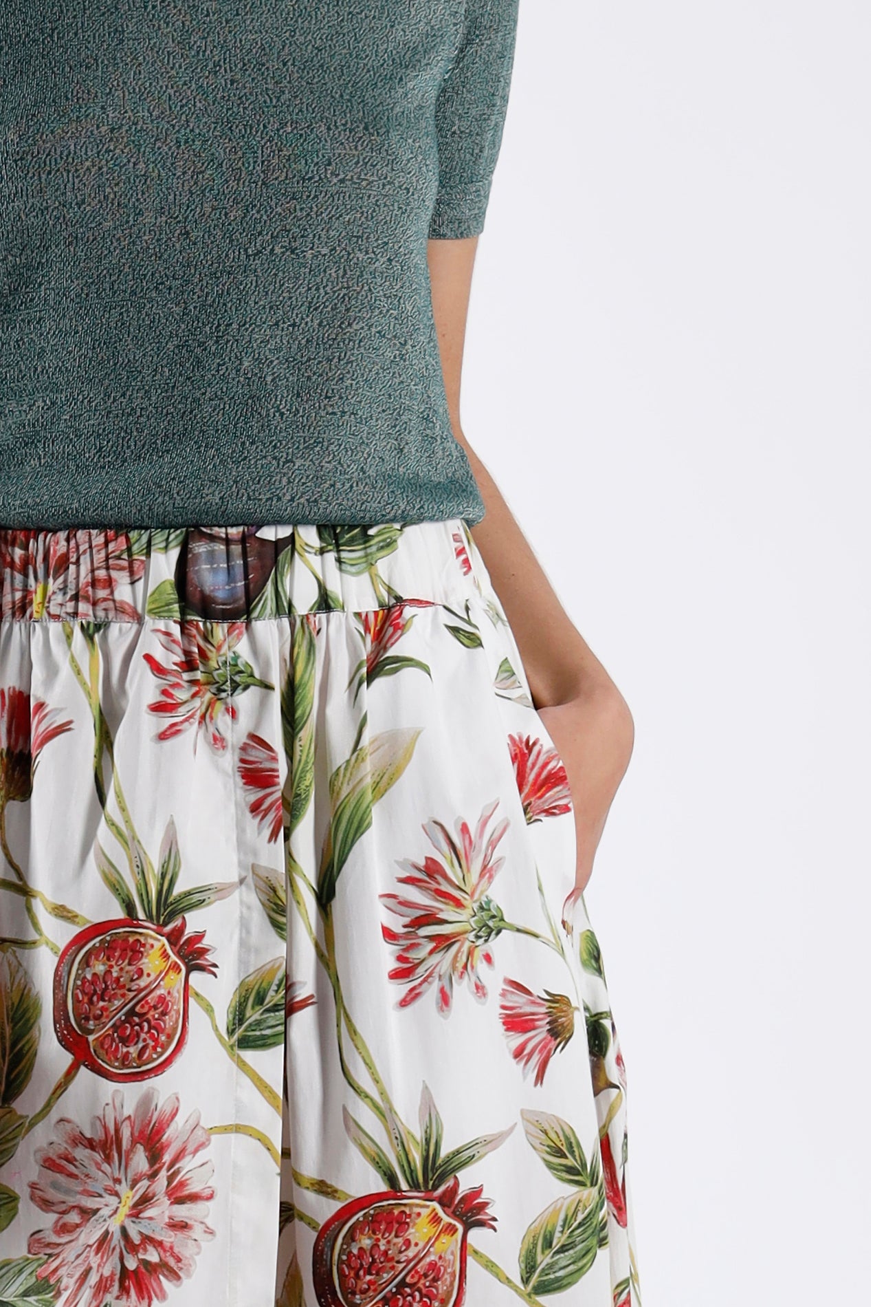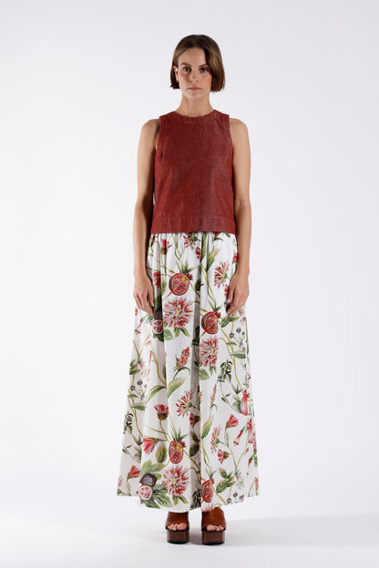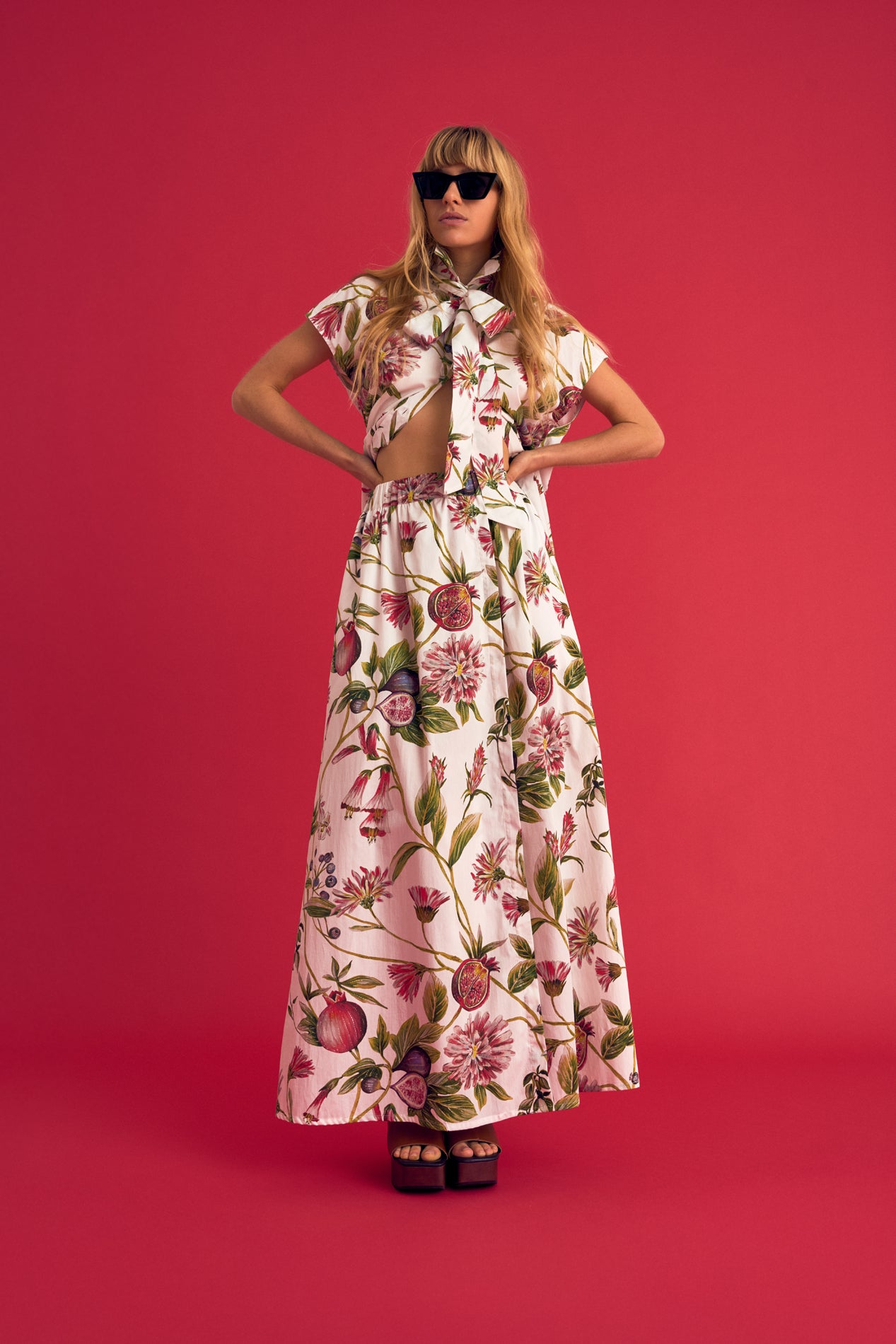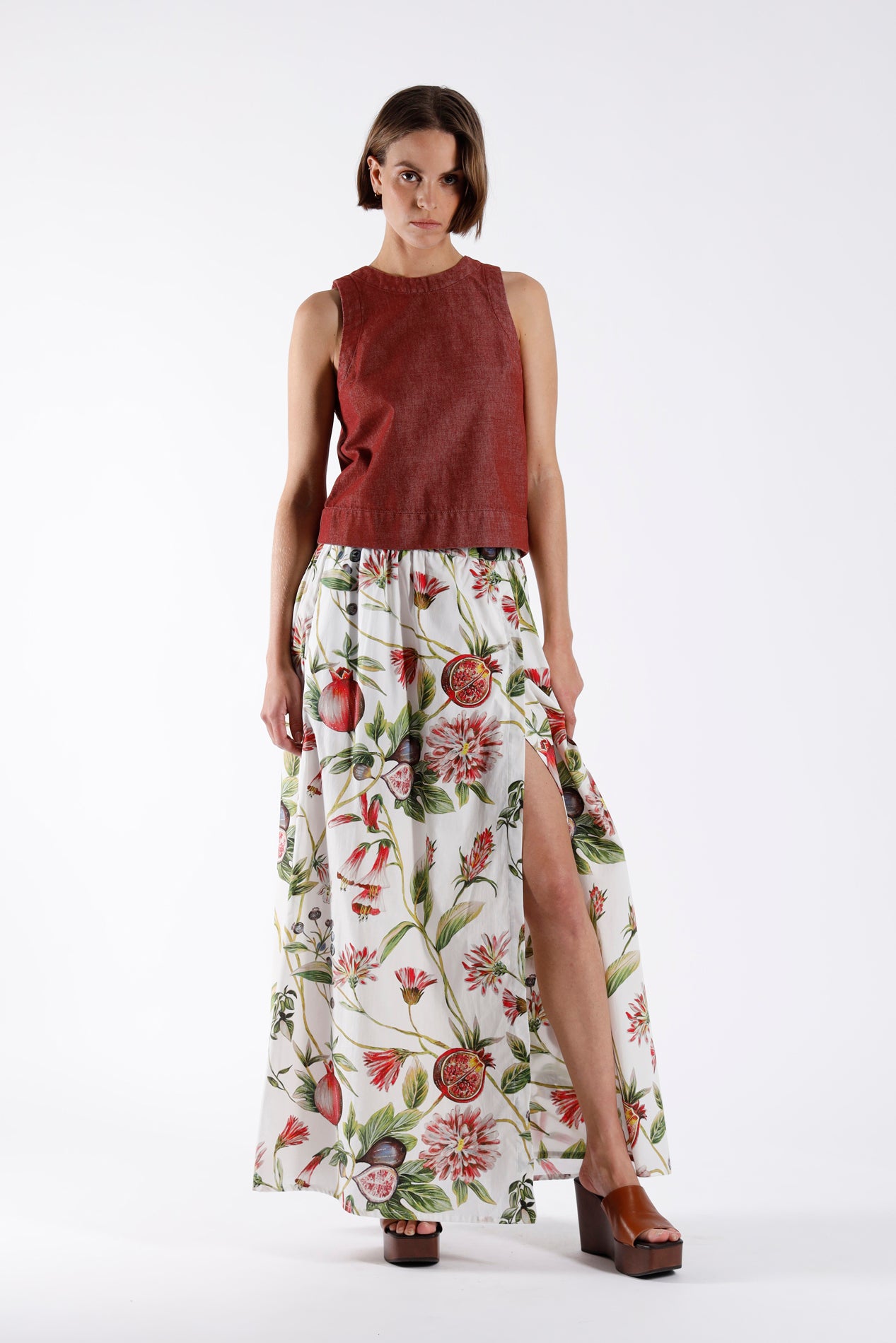 High-waist maxi skirt with bold print. Front slit, elastic waistband and hidden in-seam pockets.